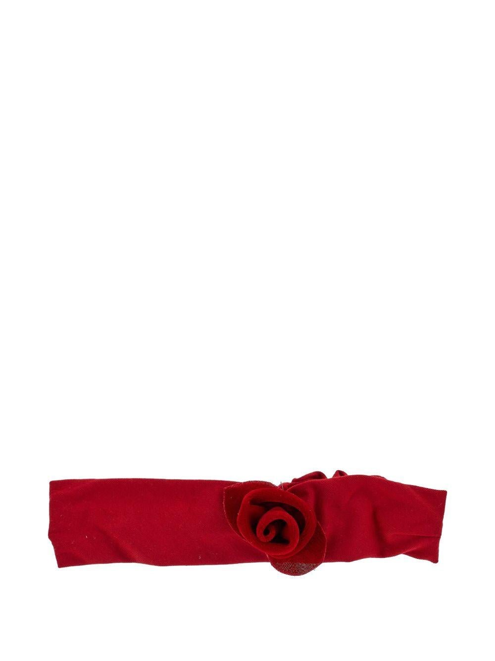 The Monnalisa red baby headband with flower appliqué is available on the RubinoKids.com online store. Made of 100% cotton, it features a red color, a decorative flower detail, a ruffled design, and an elasticated band. Available in various sizes, it is part of the Monnalisa Fall/Winter 2025 collection and is available for immediate shipment with delivery within 24-48 hours in Italy.
