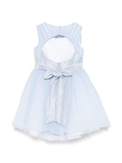 The Colorichiari light blue dress for girls with floral applique is available on the RubinoKids.com online store. Made of 100% polyester, it features an alice blue color, a hidden back zip closure, an adjustable and removable waistband, a single button closure, and a back opening. Available in various sizes, it is part of the Colorichiari Spring/Summer 2025 collection and is available for immediate shipment with delivery within 24-48 hours in Italy.
