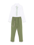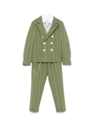 The Colorichiari green three-piece suit for boys with a striped trim is available on the RubinoKids.com online store. Made from 96% cotton, 88% viscose, 12% polyester, and 4% elastane, it features a meadow green color, a double-breasted button closure, a buttoned front placket, an elasticated waistband, and buttoned cuffs. Available in various sizes, it is part of the Colorichiari Spring/Summer 2025 collection and is available for immediate shipment with delivery within 24-48 hours in Italy.