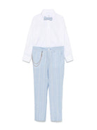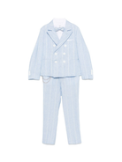 The Colorichiari three-piece suit for boys in light blue with striped trim is available on the RubinoKids.com online store. Made from 100% linen, 96% cotton, and 4% elastane, it features a sky blue color, a double-breasted button closure, a front button placket, a concealed zip and button closure, and buttoned cuffs. Available in various sizes, it is part of the Colorichiari Spring/Summer 2025 collection and is available for immediate shipment with delivery within 24-48 hours in Italy.