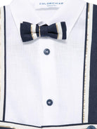 The Colorichiari baby boy's blue and white striped cardigan, shirt, and shorts set is available on the RubinoKids.com online store. Made from 100% linen, 60% cotton, 35% polyester, and 5% synthetic fiber, the white item features a front button closure, a hidden zip and button closure, and a removable bow. It comes in a set of four. Available in various sizes, it is part of the Colorichiari Spring/Summer 2025 collection and is available for immediate shipment with delivery within 24-48 hours in Italy.