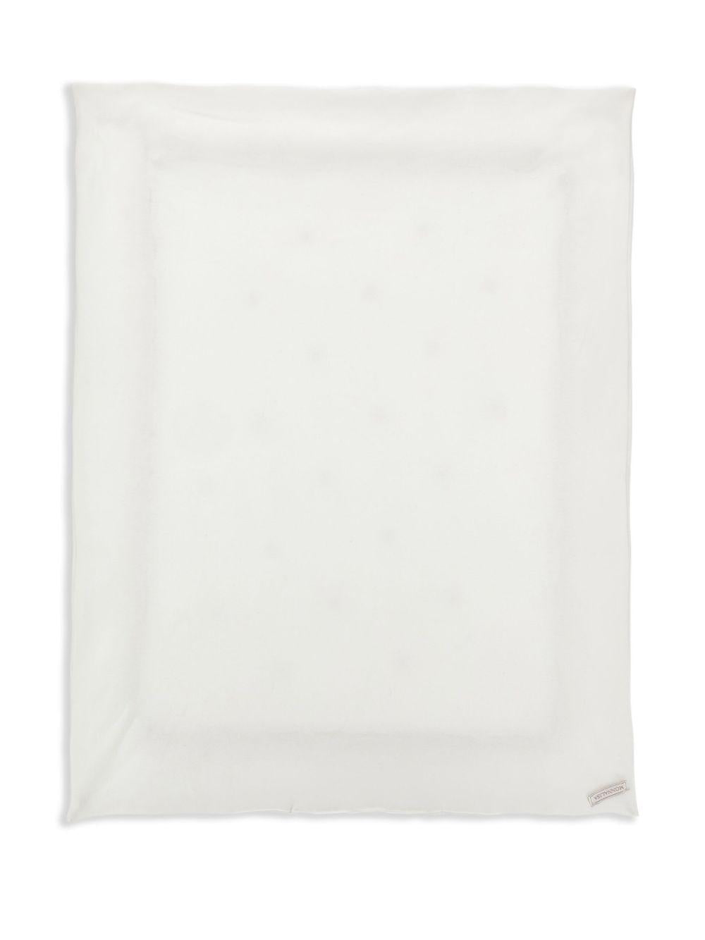 The Monnalisa white baby blanket with floral appliqué is available on the RubinoKids.com online store. Made of 100% cotton, it features a white floral appliqué and a ruffled hem. It is part of the Monnalisa Fall/Winter 2025 collection and is available for 24-48 hour delivery in Italy.