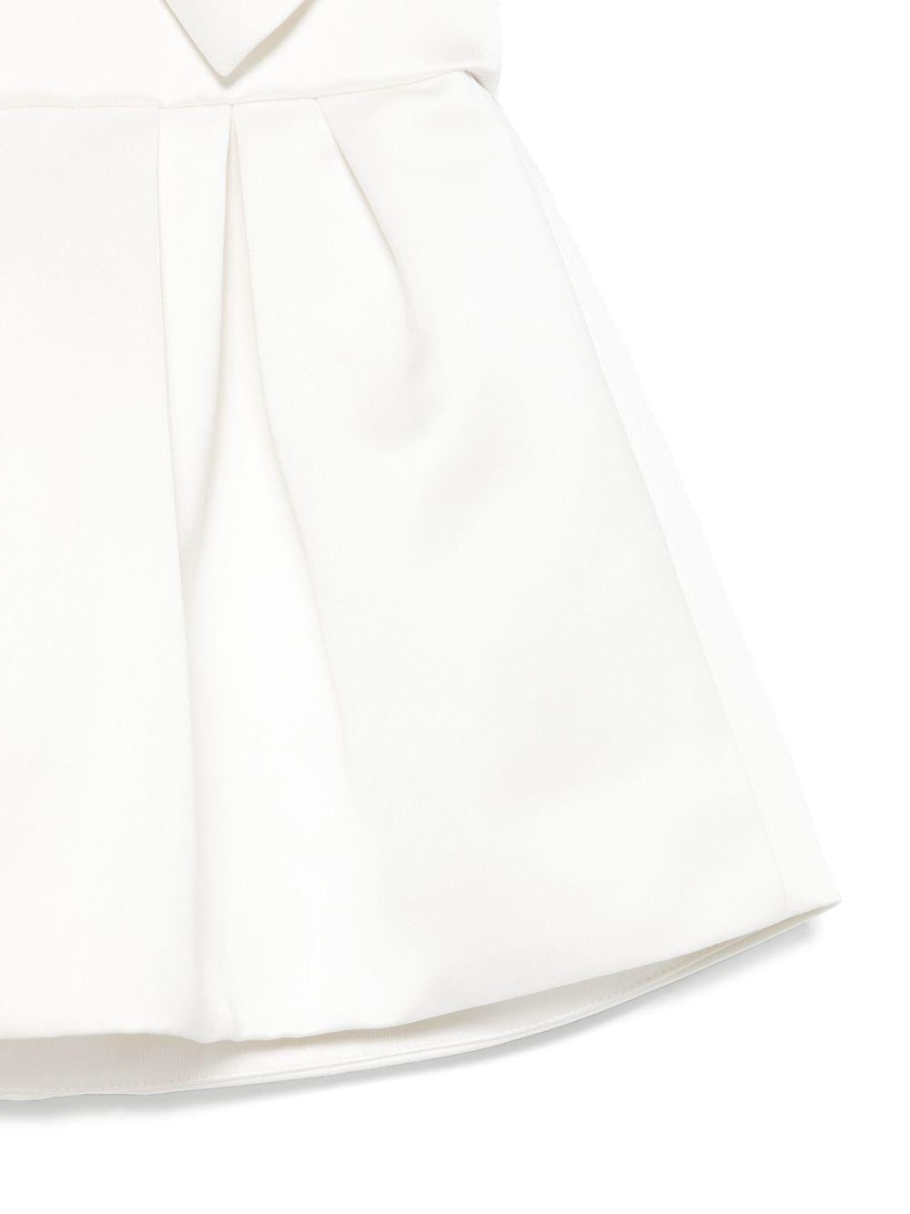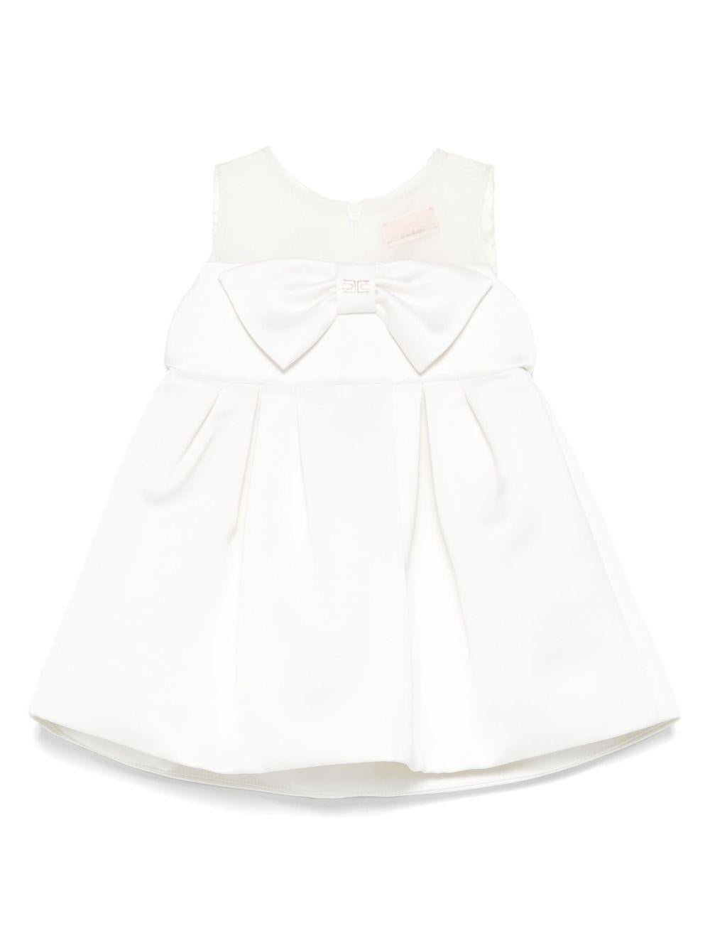 The Elisabetta Franchi La Mia Bambina white satin dress for girls is available on the RubinoKids.com online store. Made of 67% viscose, 33% polyester, it features a white color, a hidden back zip closure, an embroidered logo on the front, a bow detail, and pleated details. Available in various sizes, it is part of the Elisabetta Franchi La Mia Bambina Spring/Summer 2025 collection and is available for immediate shipment with delivery within 24-48 hours in Italy.