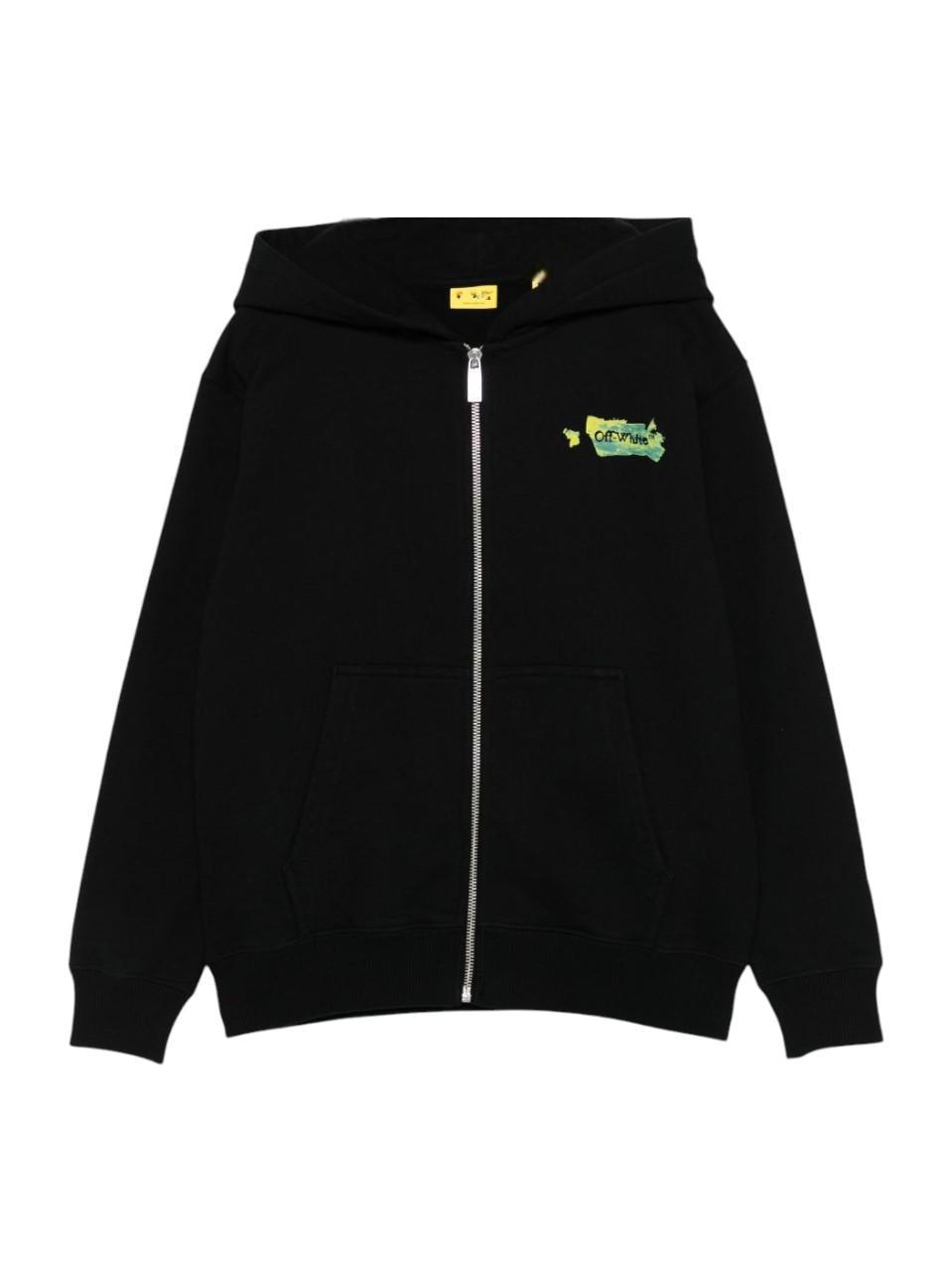 The Off-White Kids black sweatshirt with front graphic is available on the RubinoKids.com online store. Made of 100% cotton, it features a black hood, a scoop neck, a zip closure, a graphic logo on the front, a graphic print on the back, and long sleeves. Available in various sizes, it is part of the Off-White Kids Fall/Winter 2025 collection and is available for 24-48 hour delivery in Italy.
