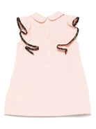 The Fendi Kids pink ruffled short dress for baby girls is available on the RubinoKids.com online store. Made of 100% cotton, it features a flamingo pink color, a snap button closure at the back, an embroidered logo on the front, a round collar, and sleeveless. Available in various sizes, it is part of the Fendi Kids Spring/Summer 2025 collection and is available for immediate shipment with delivery within 24-48 hours in Italy.
