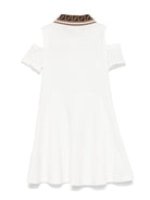The Fendi Kids white dress for girls with contrasting collar is available on the RubinoKids.com online store. Made of 100% cotton, it features a white color, a contrasting logo collar, logo embroidery on the front, short sleeves, open shoulders, and a straight hem. Available in various sizes, it is part of the Fendi Kids Spring/Summer 2025 collection and is available for immediate shipment with delivery within 24-48 hours in Italy.