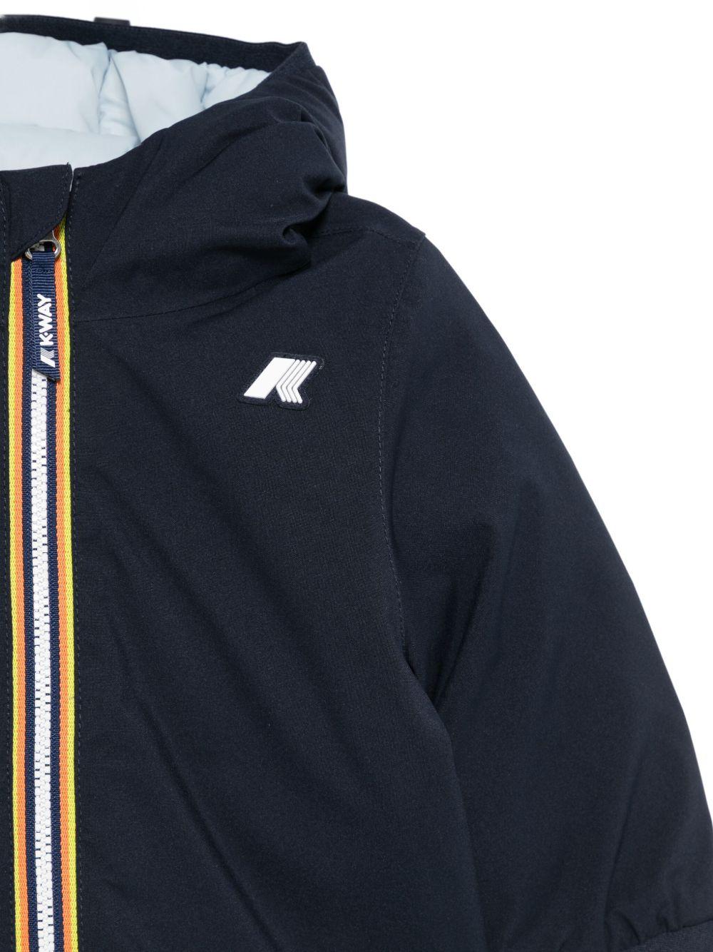 The K-Way Kids baby girl's blue reversible jacket is available on the RubinoKids.com online store. Made from 76% recycled polyester and 24% polyurethane, it features a blue color, a reversible design, a zip closure, a logo patch, and a classic hood. Available in various sizes, it is part of the K-Way Kids Fall/Winter 2025 collection and is available for 24-48 hour delivery in Italy.