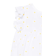 The Il Gufo white floral embroidered baby onesie with ruffled details is available on the RubinoKids.com online store. Made of 100% cotton, it features a back button closure, a crew neck, sleeveless design, and ruffled details. This size is from the Il Gufo Spring/Summer 2025 collection and is available for immediate shipment with delivery within 24-48 hours in Italy.
