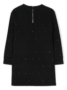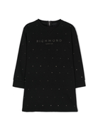 The John Richmond Junior black dress with studded logo and round neck for boys is available on the RubinoKids.com online store. Made of 100% cotton, the dress features a black cotton jersey, a studded logo, ribbed trims, a round neck, a back zip closure, long sleeves, a straight hem, and a knee-length design. Available in various sizes, it is part of the John Richmond Junior Fall/Winter 2024 collection and is available for immediate shipment with delivery within 24-48 hours in Italy.