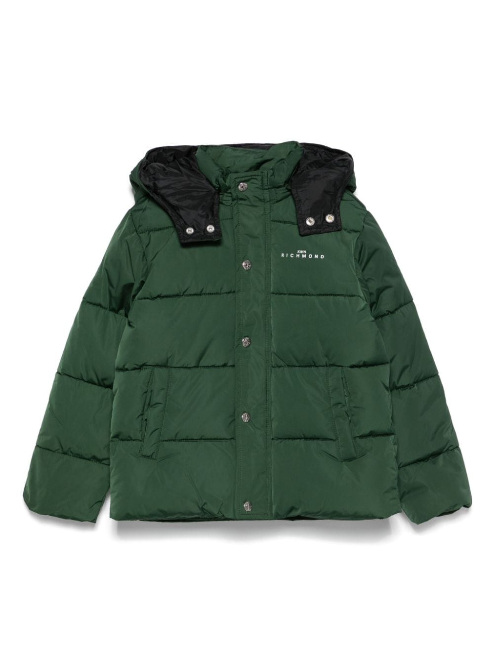 The John Richmond Junior green printed down jacket with removable hood for boys is available at the RubinoKids.com online store. Made from 100% polyester, it features a textured finish, a quilted design, a logo print on the back, a snap front closure, a concealed front zip closure, a padded design, a removable hood, long sleeves, elasticated cuffs, a logo print on the chest, two side welt pockets, and a straight hem. This size is part of the John Richmond Junior Fall/Winter 2024 collection and is available for immediate shipment with delivery within 24-48 hours in Italy.