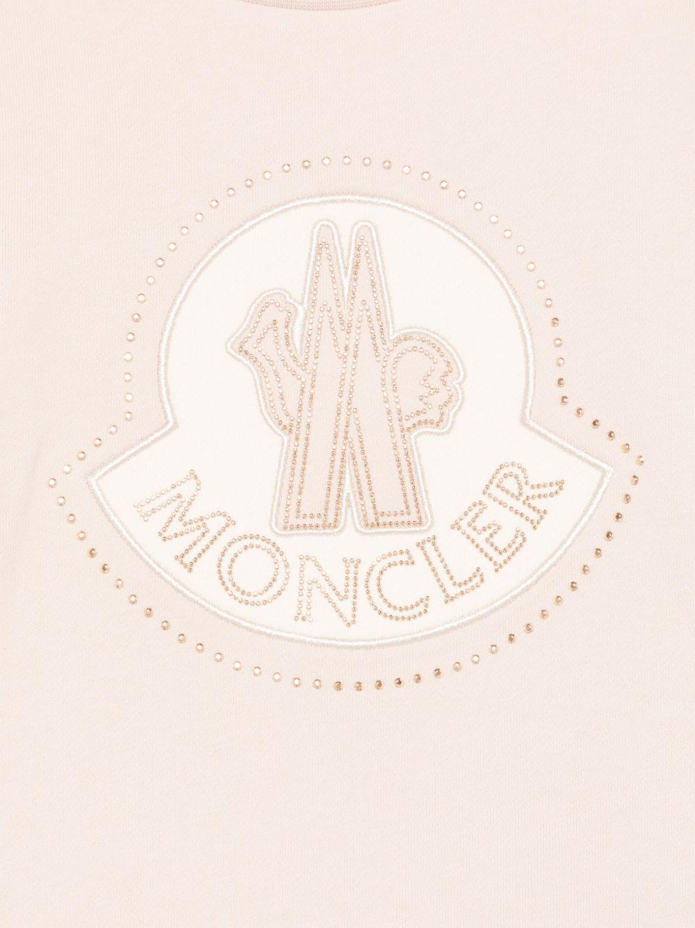 The Moncler Enfant pink sweatshirt for girls with logo appliqué is available on the RubinoKids.com online store. Made of 100% cotton, it features a powder pink color, ribbed hem and cuffs, a crew neck, and beaded detailing. Available in various sizes, it is part of the Moncler Enfant Spring/Summer 2025 collection and is available for immediate shipment with delivery within 24-48 hours in Italy.