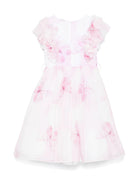 The Monnalisa white butterfly-print dress with ruffle details for girls is available on the RubinoKids.com online store. Made of 100% polyurethane, 85% lyocell, 15% polyamide, 100% cotton, and 100% polyamide. The pink/white lyocell blend dress features a hidden back zip closure, a butterfly print, a round neckline, short sleeves, ruffle hems, ruffle details, belt loops, a removable belt with a butterfly appliqué, a fitted waist, a voluminous skirt, layered details, a cotton lining, and a flared hem. Available in various sizes, it is part of the Monnalisa Spring/Summer 2025 collection and is available for immediate shipment with delivery within 24-48 hours in Italy.