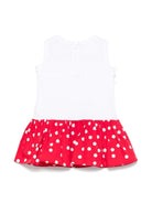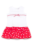 The Monnalisa white baby girl dress with polka dot ruffle skirt is available on the RubinoKids.com online store. Made of 100% cotton, it features a white/red cotton blend, jersey weave, a single button closure at the back, a round neckline, sleeveless, lace trim, a bow detail, a polka dot skirt, a ruffle skirt, an unlined design, and a ruffled hem. Available in various sizes, it is part of the Monnalisa Spring/Summer 2025 collection and is available for immediate shipment with delivery within 24-48 hours in Italy.