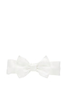 The Monnalisa white satin baby headband with bow is available on the RubinoKids.com online store. Made of 100% cotton, it features a white color, an oversized bow detail, an elastic band, a smooth finish, and draped decoration. Available in various sizes, it is part of the Monnalisa Fall/Winter 2025 collection and is available for immediate shipment with delivery within 24-48 hours in Italy.