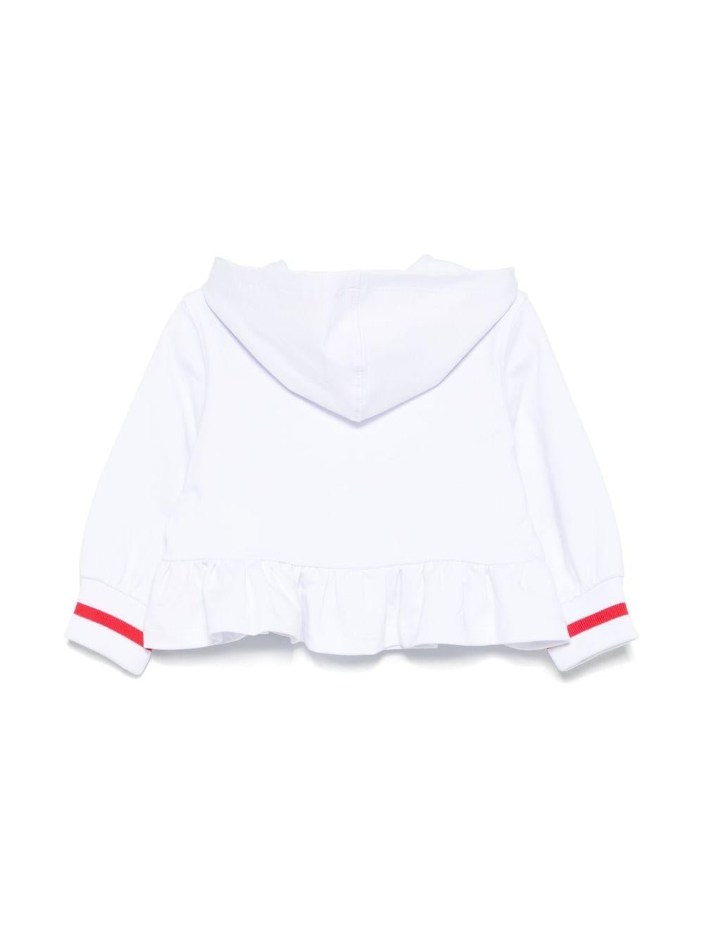 The Monnalisa pink baby girl's hoodie with bow print and ribbed cuffs is available on the RubinoKids.com online store. Made from 95% cotton and 5% spandex/elastane, it features a front zip closure, a hood, a peplum design, and ribbed cuffs. This size is part of the Monnalisa Spring/Summer 2025 collection and is available for immediate shipment with delivery within 24-48 hours in Italy.