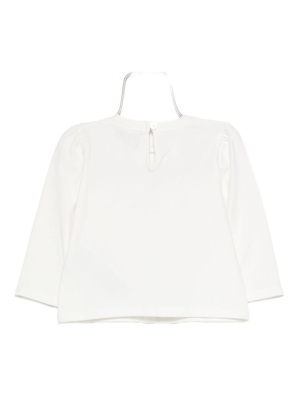 The Moschino Kids white baby girl's T-shirt with Teddy Bear motif is available on the RubinoKids.com online store. Made of 95% cotton, 5% elastane, it is white, long sleeves, and has a back button closure. Available in various sizes, it is part of the Moschino Kids Fall/Winter 2025 collection and is available for delivery in Italy within 24-48 hours.