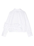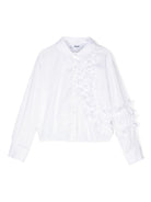 The MSGM Kids white poplin shirt for girls is available on the RubinoKids.com online store. Made of 66% cotton, 31% nylon, and 3% elastane, the white cotton-blend poplin shirt features a button-up front, a classic collar, ruffled trim, long sleeves, buttoned cuffs, and an elasticated hem. Available in various sizes, it is part of the MSGM Kids Fall/Winter 2024 collection and is available for immediate shipment with delivery within 24-48 hours in Italy.