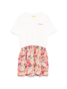 The Off-White Kids white short-sleeved printed dress for girls is available on the RubinoKids.com online store. Made of 100% polyester and 100% cotton, it features two side flap pockets, a crew neck, and short sleeves. This size is from the Off-White Kids Spring/Summer 2025 collection and is available for immediate shipment with delivery within 24-48 hours in Italy.
