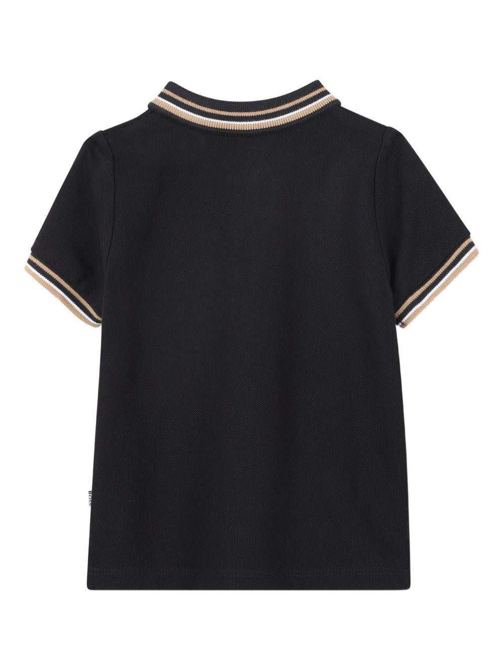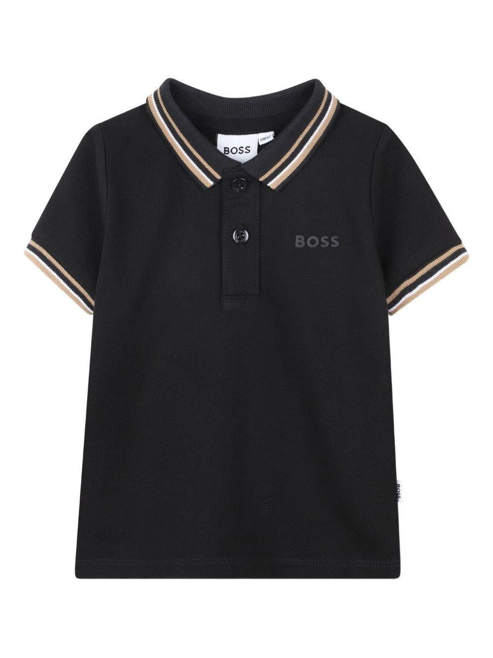The Boss Kids black polo shirt for babies with a striped collar is available on the RubinoKids.com online store. Made from 100% cotton, it features a black color, a two-button placket, an embroidered logo, a contrasting collar, and short sleeves. Available in various sizes, it is part of the Boss Kids Fall/Winter 2025 collection and is available for 24-48 hour delivery in Italy.
