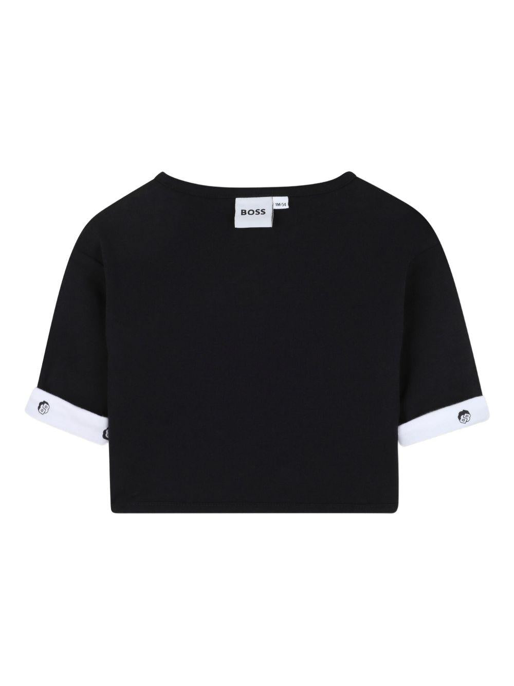 The Boss Kidswear multicolored reversible T-shirt and trousers set for newborns with logo is available on the RubinoKids.com online store. Made of 100% cotton, the item features a black and white color scheme, a logo detail, stud decoration, short sleeves, and an elasticated waist. Available in various sizes, it is part of the Boss Kidswear Fall/Winter 2025 collection and is available for immediate shipment with delivery within 24-48 hours in Italy.