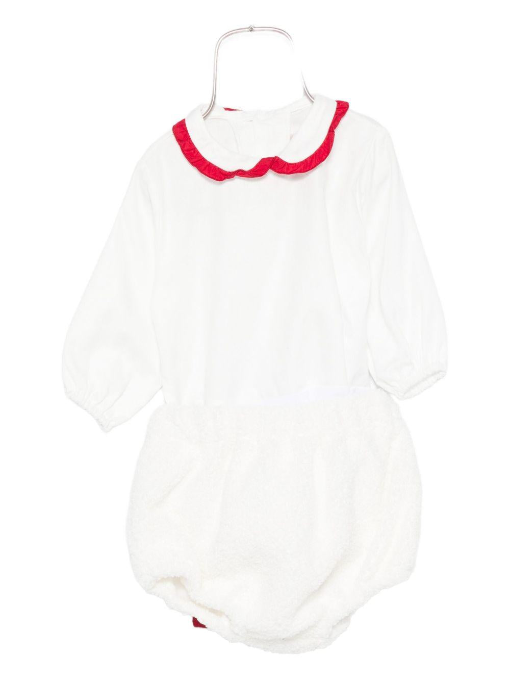 The La Stupenderia white t-shirt and shorts set for newborns with red bow detail is available on the RubinoKids.com online store. Made of 100% fabric, it features a white color, a ruffled collar, a red/green bow detail, and an elastic waistband. Available in various sizes, it is part of the La Stupenderia Fall/Winter 2025 collection and is available for 24-48 hour delivery in Italy.