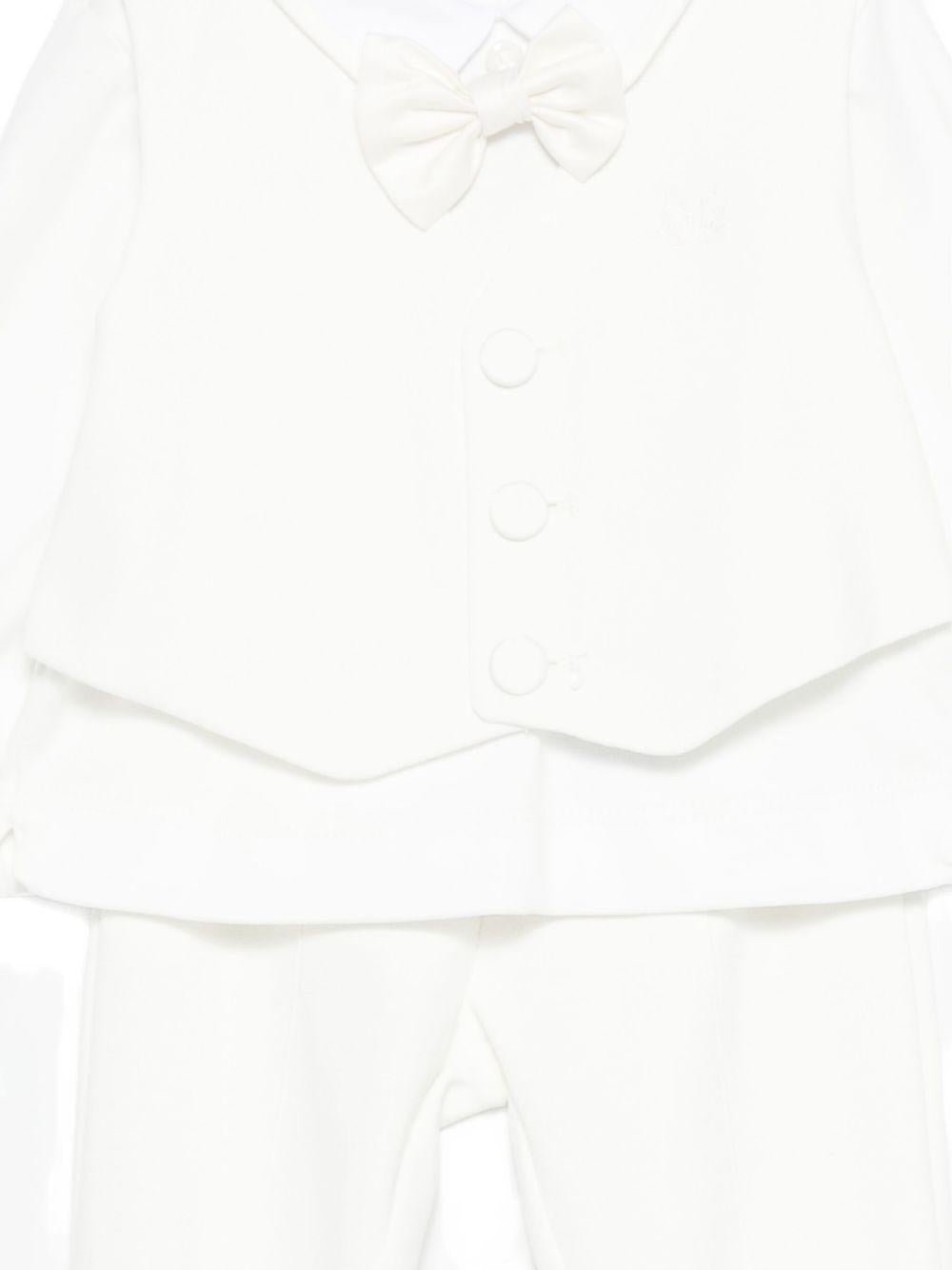 Bow tie, buttons down the front, feet-up trousers, and a matching hat. Available in various sizes, it's part of the Monnalisa Fall/Winter 2025 collection and is available for 24-48 hour delivery in Italy.
