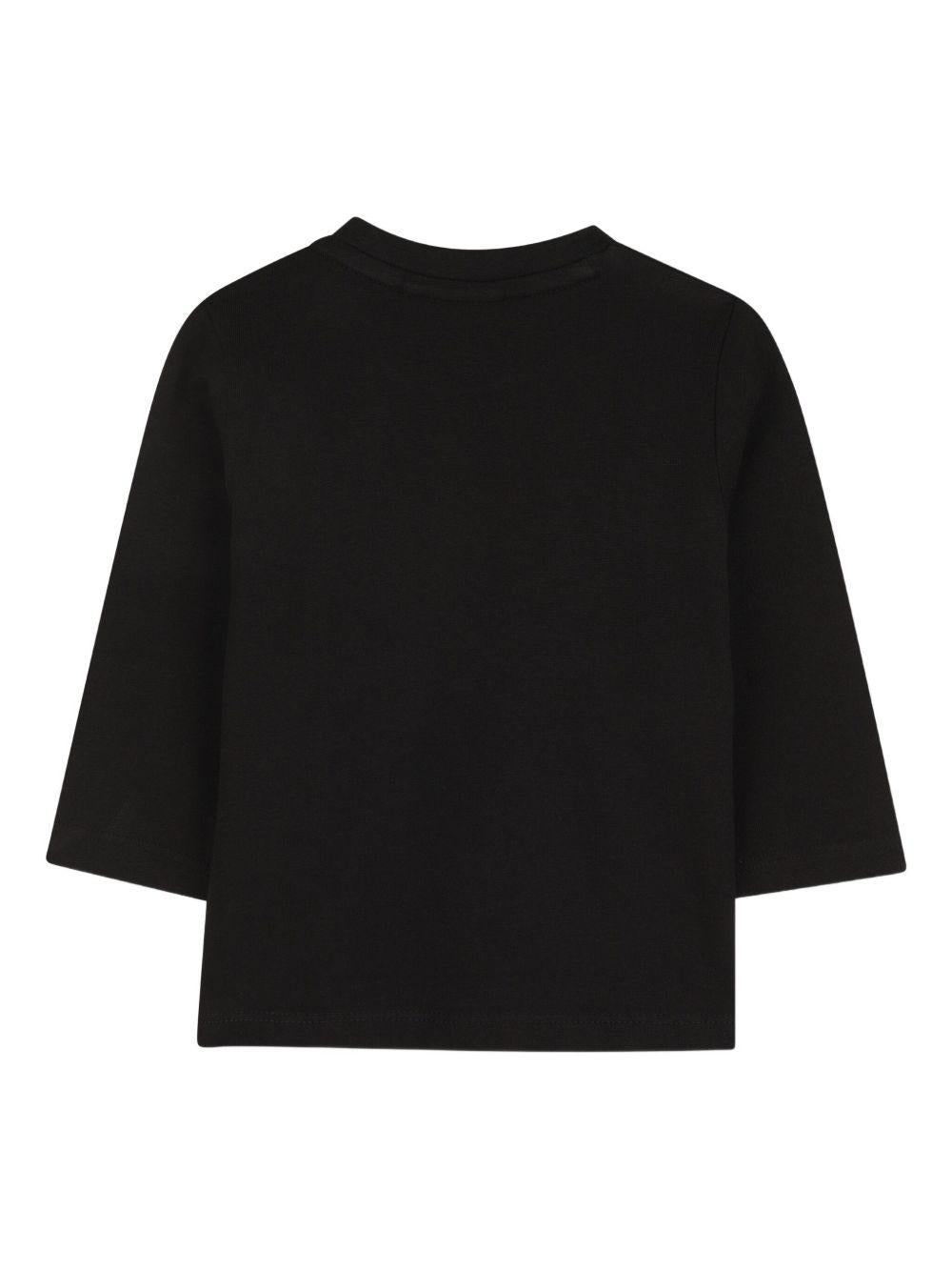 The black BOSS Kids baby T-shirt with logo print is available on the RubinoKids.com online store. Made of 100% cotton, it features a black color, long sleeves, a crew neck, a logo print, cotton, and a snap closure on the shoulder. Available in various sizes, it is part of the BOSS Kids Fall/Winter 2025 collection and is available for delivery in 24/48 hours in Italy.