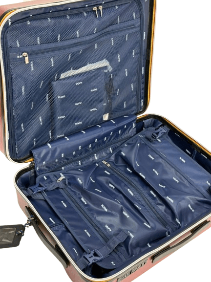 The K-Way Kids Eudoxieur trolley for children in red with a tone-on-tone embossed K-Way monogram is available on the RubinoKids.com online store. Made of 100% polycarbonate, it features a red hardside carry-on suitcase, a hard polycarbonate shell, a polyester lining with an all-over logo print, a removable divider with mesh inserts, a small zip pocket, a drawstring laundry bag, four 360° spinner wheels, an extendable aluminum handle, a TSA combination lock, a luggage tag, and a tone-on-tone embossed K-Way monogram. It is part of the K-Way Kids Fall/Winter 2025 collection and is available for 24/48 hour delivery in Italy.