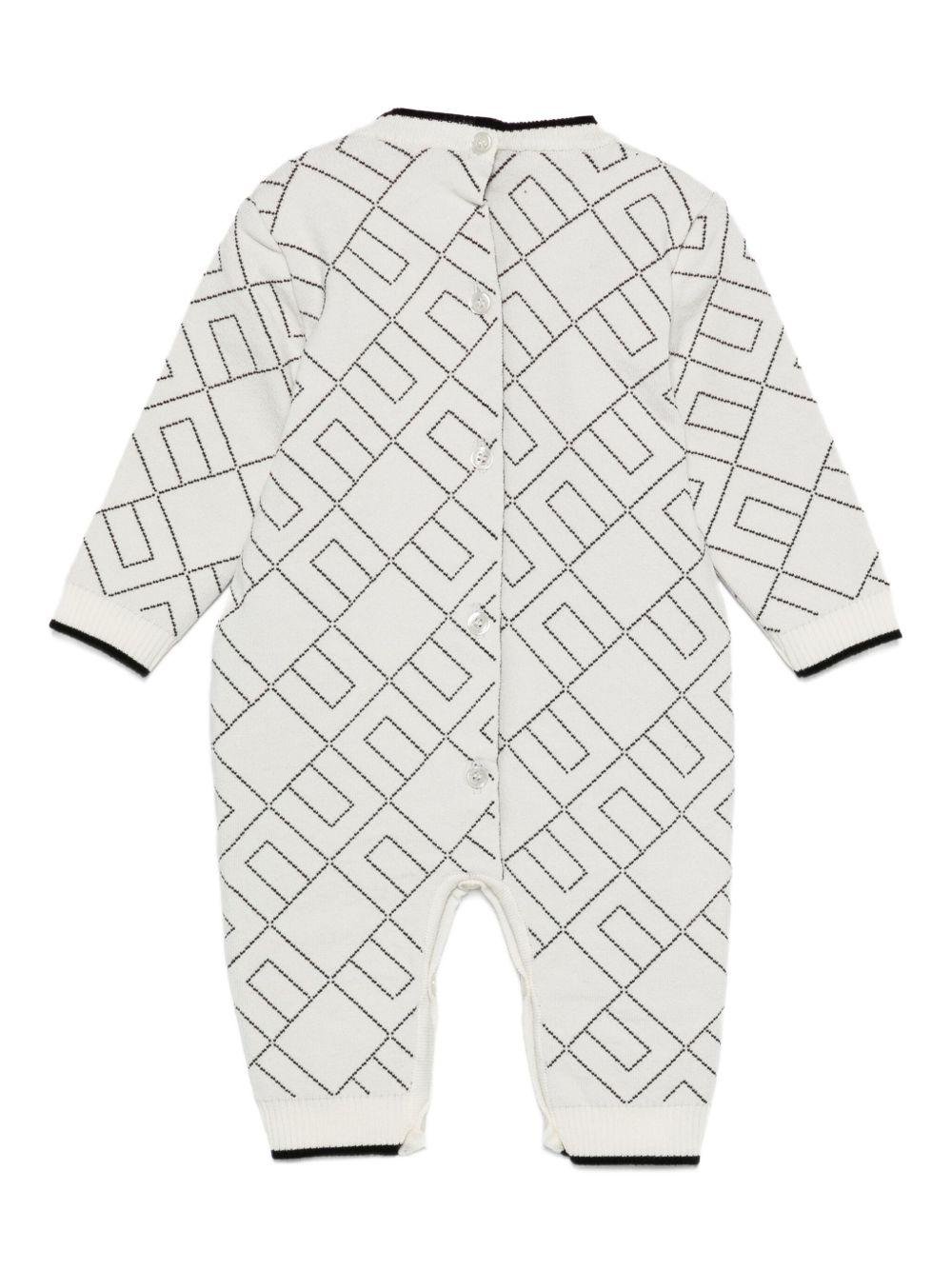 The Elisabetta Franchi La Mia Bambina white baby girl's printed onesie is available on the RubinoKids.com online store. Made of 52% viscose, 29% polyester, and 19% polyamide, it features a matte white color, a logo motif, long sleeves, a crew neck, a button closure, and a knitted design. Available in various sizes, it is part of the Elisabetta Franchi La Mia Bambina Fall/Winter 2025 collection and is available for immediate shipment with delivery within 24-48 hours in Italy.