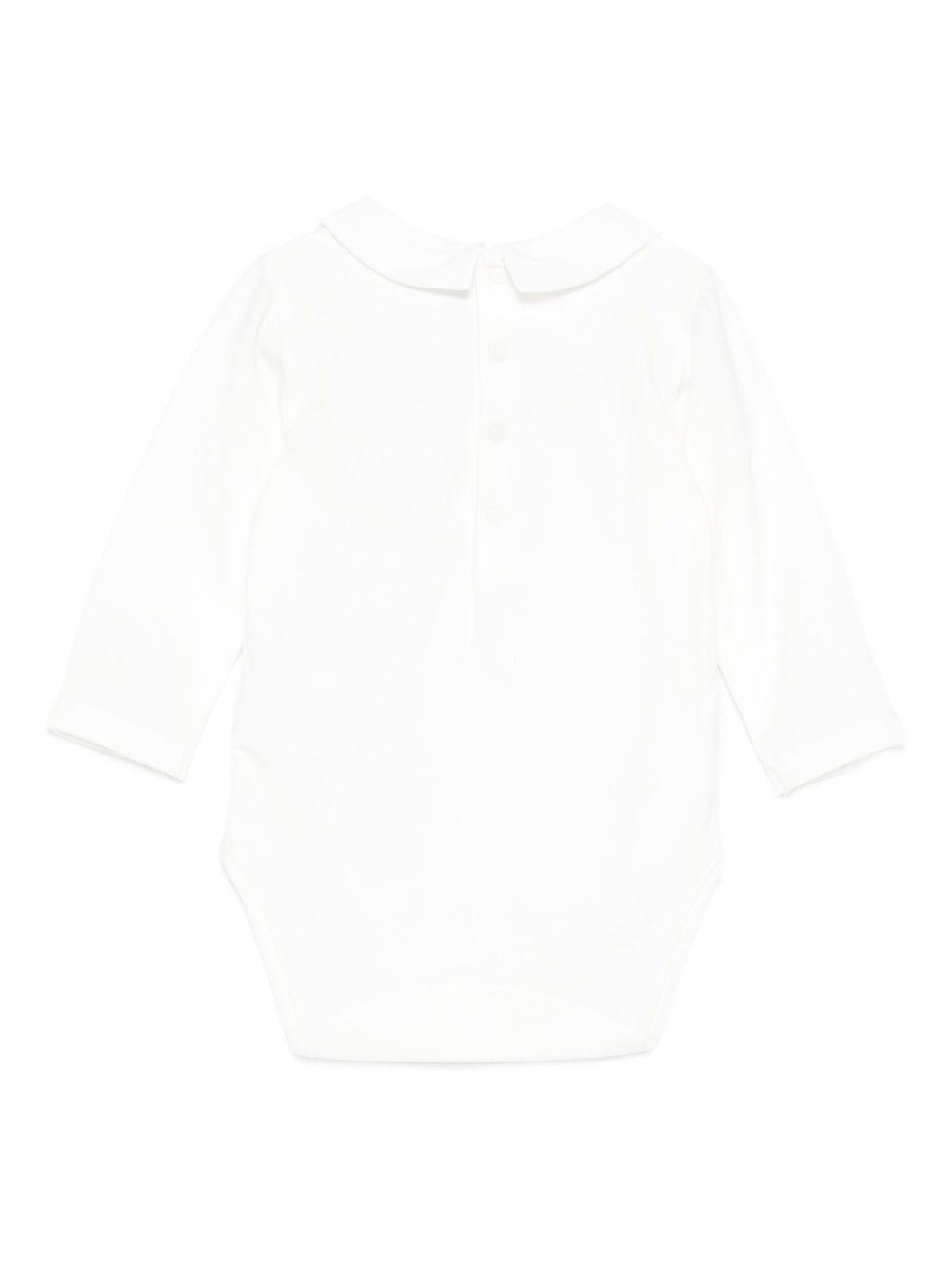The Tartine Et Chocolat white baby onesie with embroidered detail is available on the RubinoKids.com online store. Made of 95% cotton, 5% elastane, it features white, long sleeves, a Peter Pan collar, embroidered detail, and a snap closure. Available in various sizes, it is part of the Tartine Et Chocolat Fall/Winter 2025 collection and is available for 24-48 hour delivery in Italy.