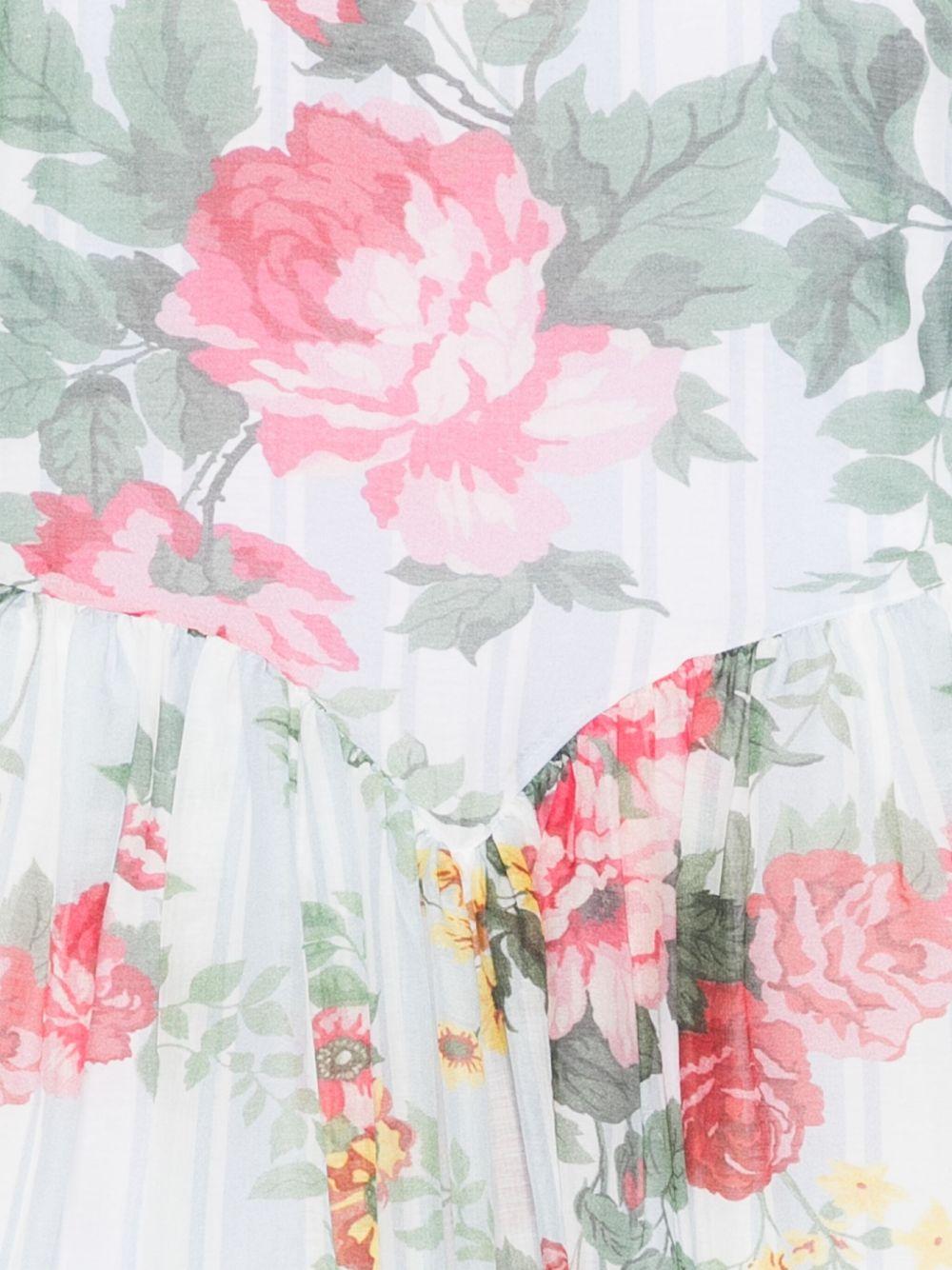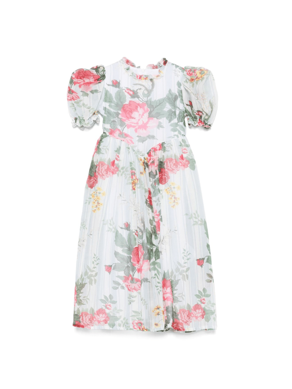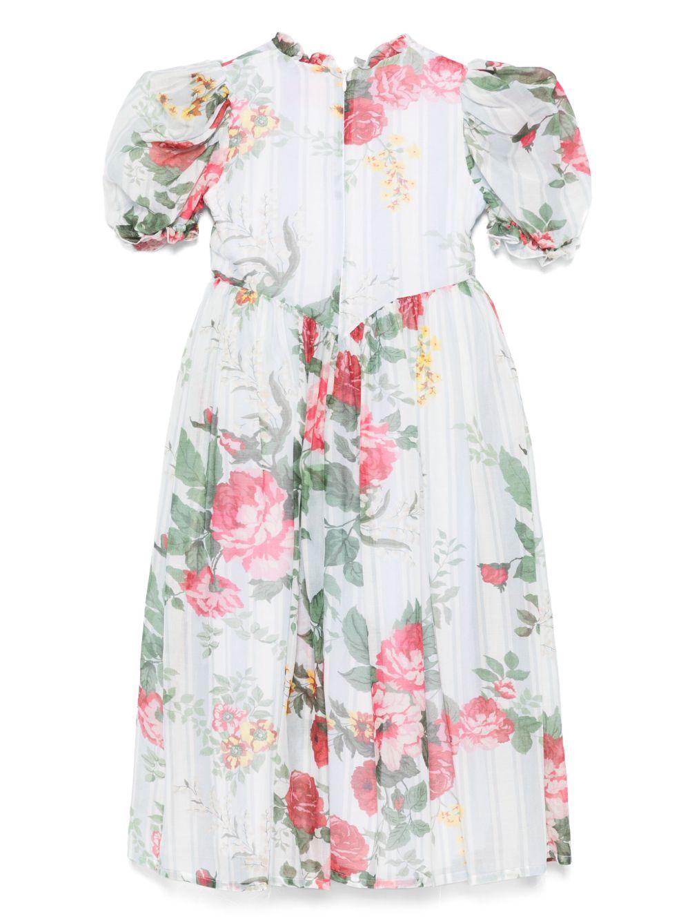 The Vivetta baby girl's light blue cotton and silk dress with a round neck is available on the RubinoKids.com online store. Made from 65% cotton, 35% silk; 100% cotton lining. The light blue dress features a back zip closure, a round neckline, and an all-over floral print. Available in various sizes, it is part of the Vivetta Spring/Summer 2025 collection and is available for immediate shipment with delivery within 24-48 hours in Italy.